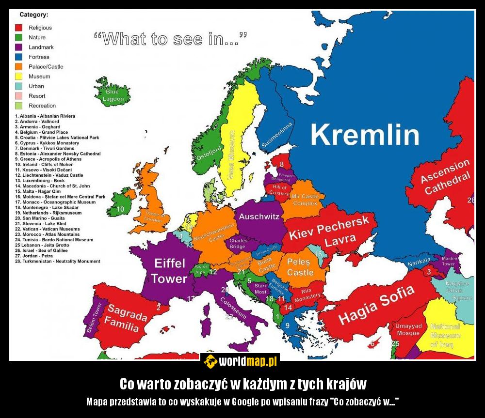 Mapa przedstawia to co wyskakuje w Google po wpisaniu frazy "Co zobaczyć w..."