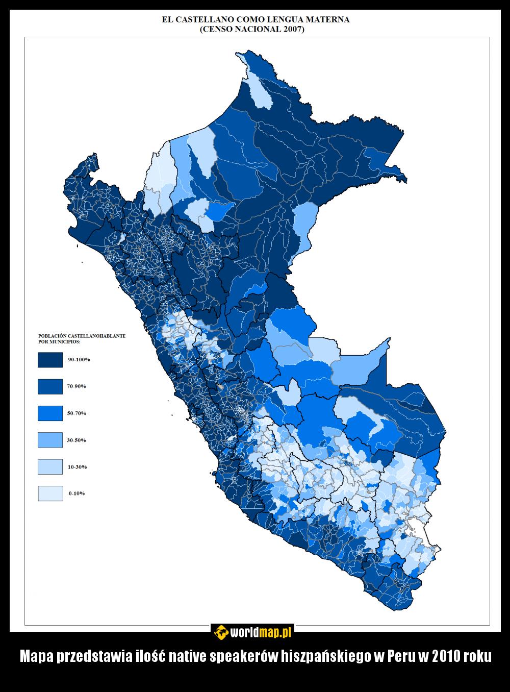 Mapa przedstawia ilość native speakerów hiszpańskiego w Peru w 2010 roku