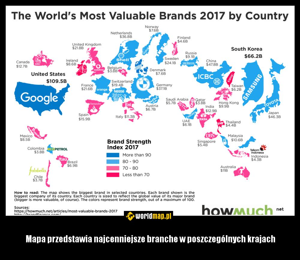 Mapa przedstawia najcenniejsze branche w poszczególnych krajach