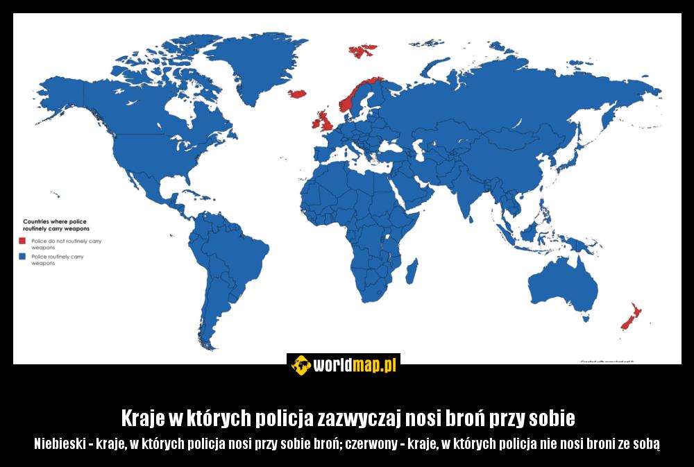 Niebieski - kraje, w których policja nosi przy sobie broń; czerwony - kraje, w których policja nie nosi broni ze sobą