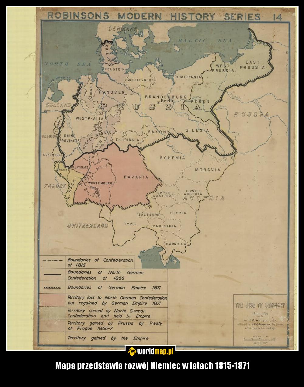 Mapa przedstawia rozwój Niemiec w latach 1815-1871